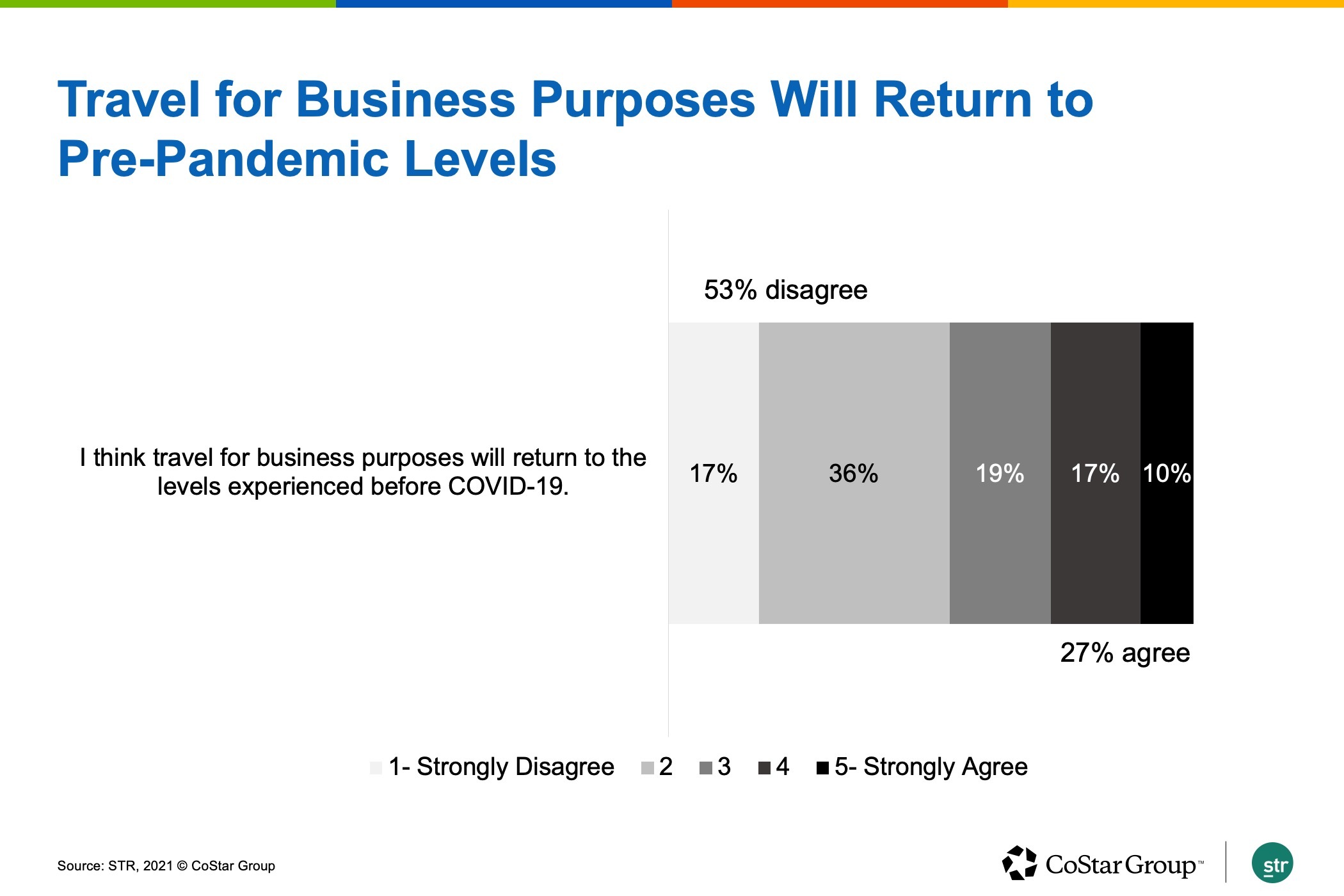 Compounding this negative sentiment toward business travel are attitudes regarding business travel more generally. When asked whether travel for business purposes will return to pre-pandemic levels, more than half disagreed. On the positive side, there is a small segment that is optimistic, with more than one-quarter of business travelers agreeing that travel for business purposes will return to levels experience before the pandemic.
