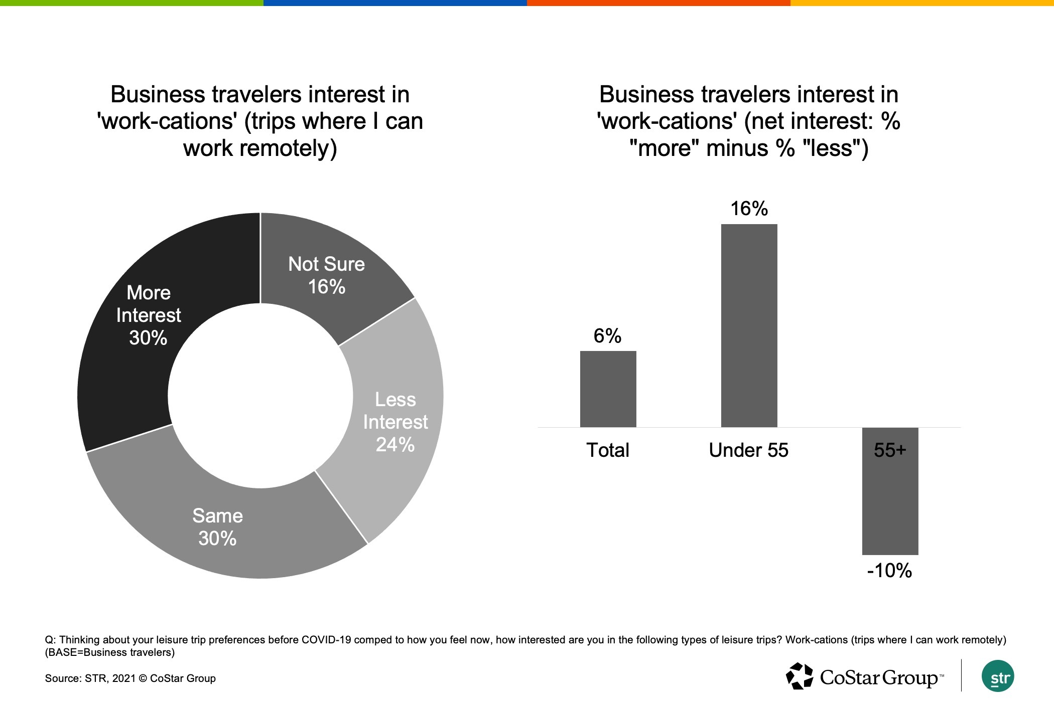 A phenomenon that gained momentum during the pandemic and one that may offer some positive news for the travel industry is the “work-cation.” There was positive sentiment about the concept of being able to work while traveling among business travelers surveyed. Almost one-third (30%) of business travelers stated they would be more interested in a “work-cation” compared with pre-pandemic times, resulting in a net positive interest score of 6%. Among younger business travelers, interest was more than twice as high with a net positive of 16%.